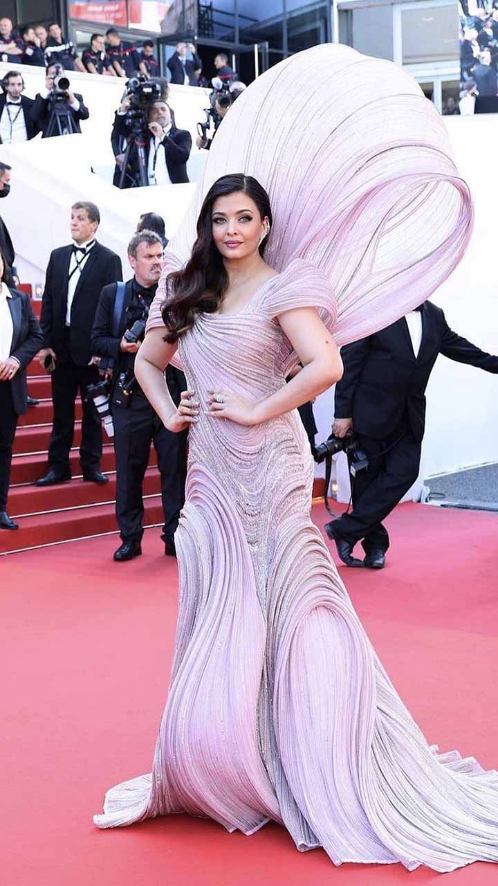 Aishwarya Rai Bachchan marked her 20th year on the red carpet at the Cannes Film Festival 2022. The style maverick chose a pastel pink sculpted gown by the couturier Gaurav Gupta. The structural wonder featured a cape that extended above.