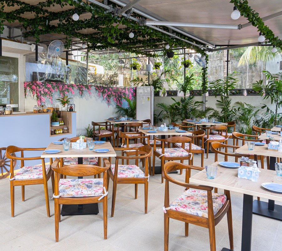 The sun-drenched alfresco area feels perfect if you are still wary of crowds. The hand-painted bougainvillaea walls, lush greenery, and dangling creepers lend a gardenesque vibe. The swings lining one of the walls add a sense of whimsy to the area.