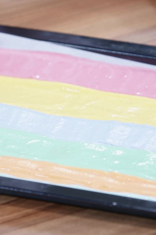 Here chef Tejasvi makes sponge cake batter and adds different colours to different portions of the batter. She then bakes these multicoloured cakes and fills them with strawberry jam and cream cheese frosting.