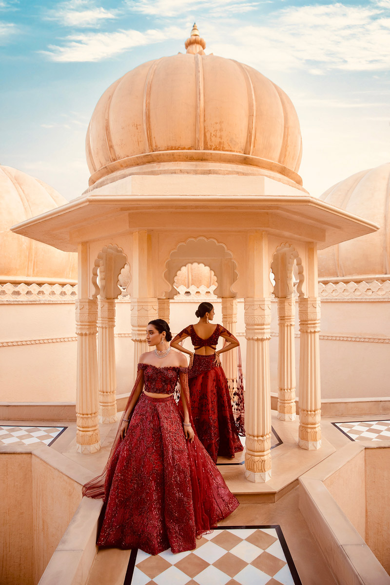 Shantanu & Nikhil's women collection on the other hand comprised voluminous drapes, constructed bodice, all decked with hand embroidery, and shimmery crystals. Not to mention the leather applique. While their signature crimson lehengas were the main highlight of the collection, other shades of gold, black, navy, and red, with multi-coloured couture prints, formed the rest of the colour palette. The show was set up in Suryagarh, Jaisalmer.