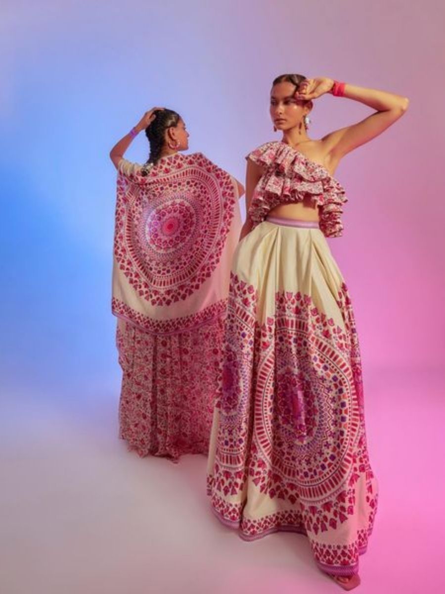 From oversized shirting to ballooned silhouettes; a continuation of the puff sleeve trend as well as kaftans, as the mood-boosting styles, will remain till the end of the year. Our signature silhouette like the one-shoulder drape saree and drape dresses will continue to rock too.